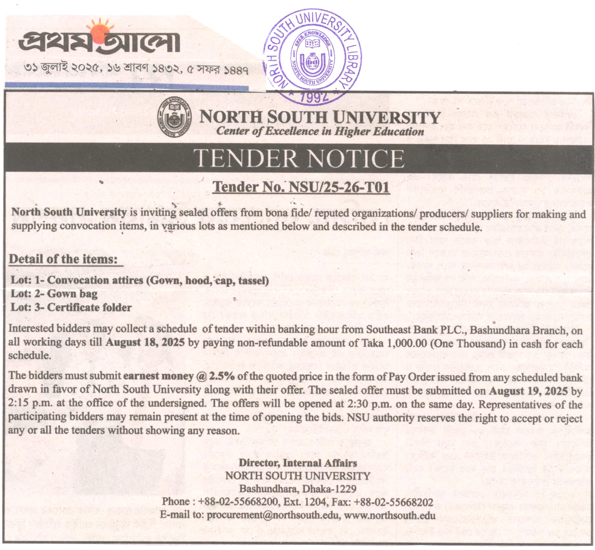 - Tender No. NSU-25-26- T-01 (Convocation Attires)- প্রথম আলো 001.jpg